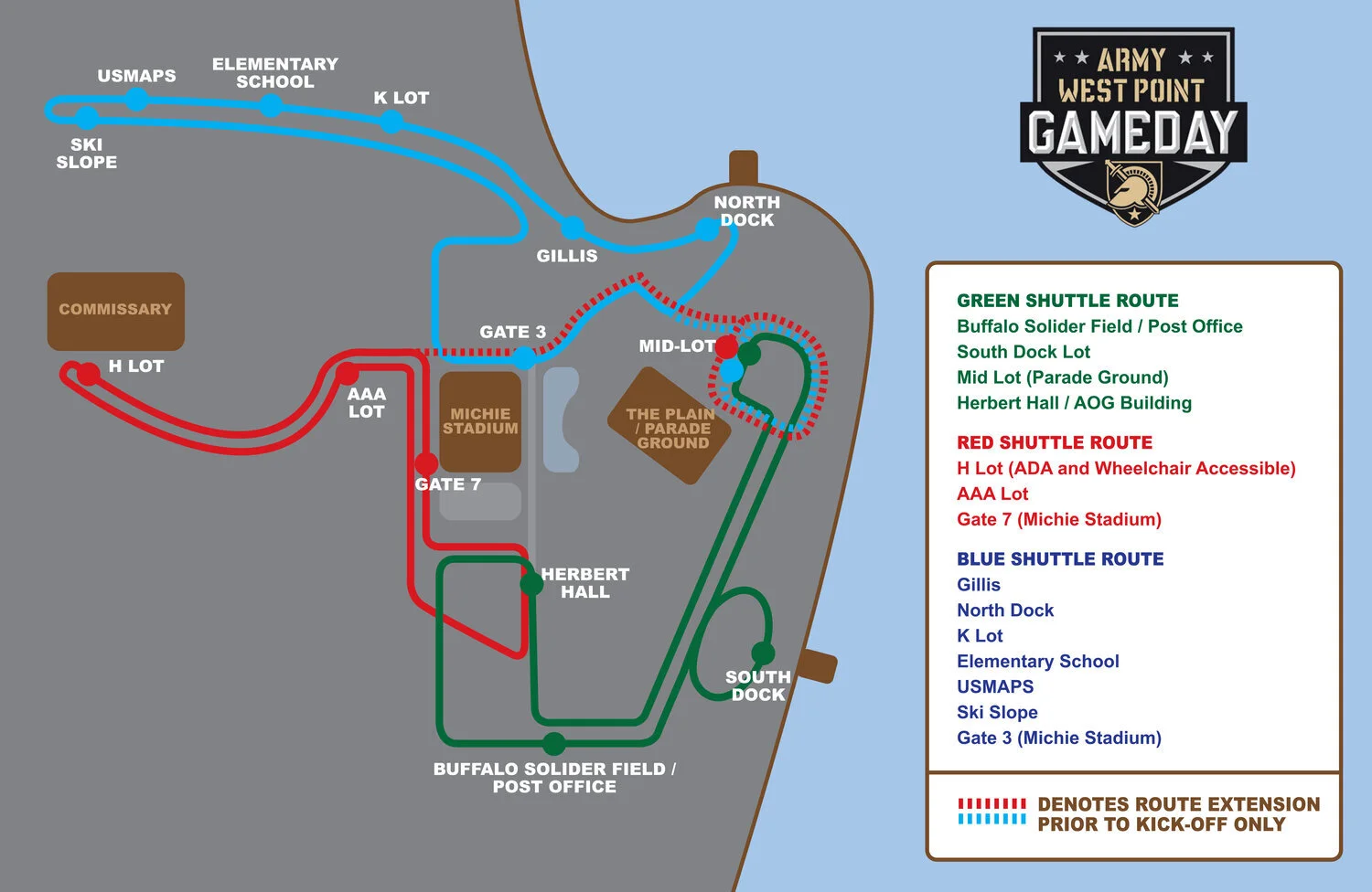 *ADA and wheelchair accessible parking and bus transportation is available by entering Stony Lonesome Gate and parking in H Lot. Fans requiring this assistance DO NOT need an advance parking pass for parking in H Lot. H Lot is available for transportation to the parade ground and to Gate 1 and Gate 5 of Michie Stadium (1 Stony Lonesome Road, West Point, NY).